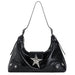 This aesthetic shoulder bag featuring a semi-structured hobo form. shiny surface. and metallic star decor. The standout flap is secured with a large star-shaped buckle. Comes in two colors — sharp black and muted pink
