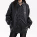 This oversized jacket features a minimalist design with a small embroidered star detail. a front zip closure. and a relaxed silhouette